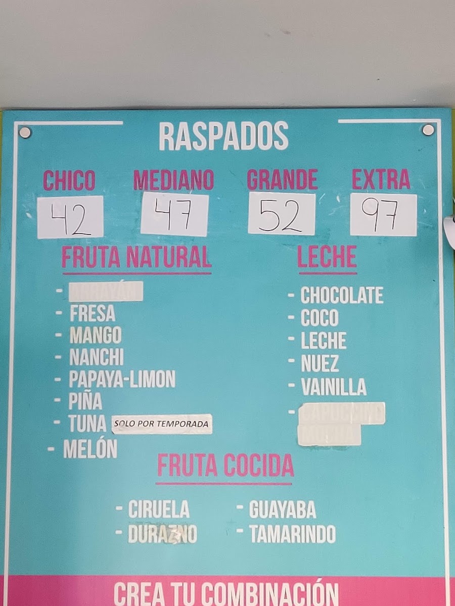 Offering a selection well-suited for warm weather refreshments and light snacks, the menu is structured around frozen desserts with fruity syrups made from natural ingredients. This makes it a fitting choice for coffee breaks, afternoon treats, or casual light meals. Customers typically order individual raspados or light snacks, reflecting the menu’s focus on easy-to-enjoy, single-serving items.